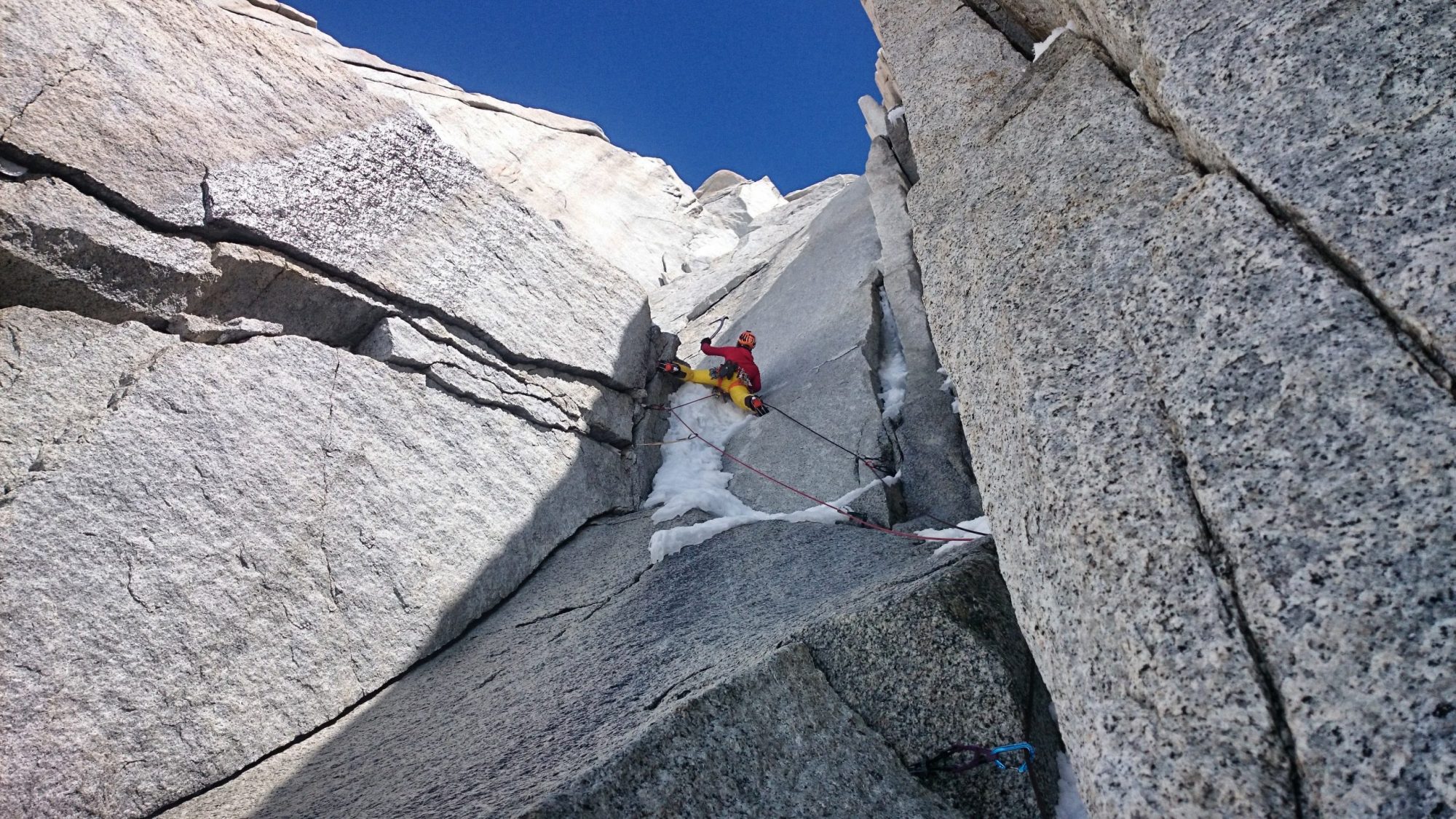 • Material: Piolet, crampones, 6 cintas exprés largas, 2 tornillos de hielo, 3 pitones de roca, 1 juego de friends (Con uno más se pasa mas cómodo), 1 juego de empotradores, algunas vagas largas de reunión, pies de gato.