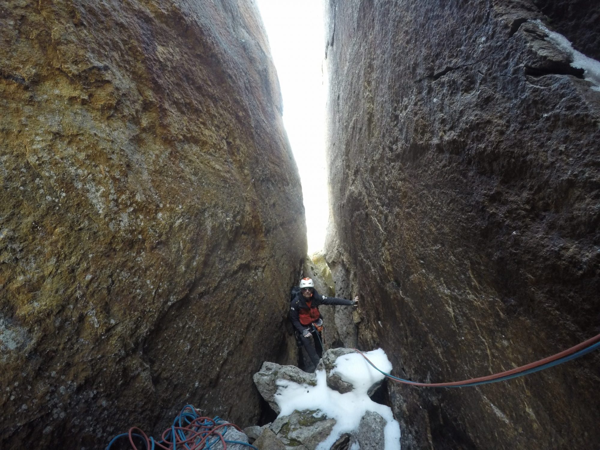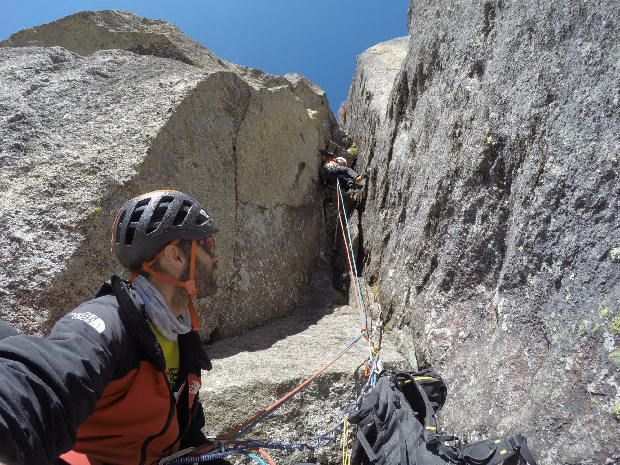 • Descenso: una vez alcanzada la cumbre descender unos 30m en dirección opuesta al campo base. De aquí un rapel de unos 25 m hasta una explanada. Desde esta explanada seguimos en dirección opuesta al C.B hasta que esta se acaba. atravesamos entre dos bloques grandes y seguimos andando en la misma dirección, hasta que después de un destrepe fácil y corto, tiremos otro rapel (esta vez 60m) primero recto y luego tendencia a la derecha según miramos para abajo. Aquí encontramos otro rapel montado con dos pitones y un empotrador. Serán otros 60 m que nos dejarán cerca del suelo hasta donde llegaremos destrepando.